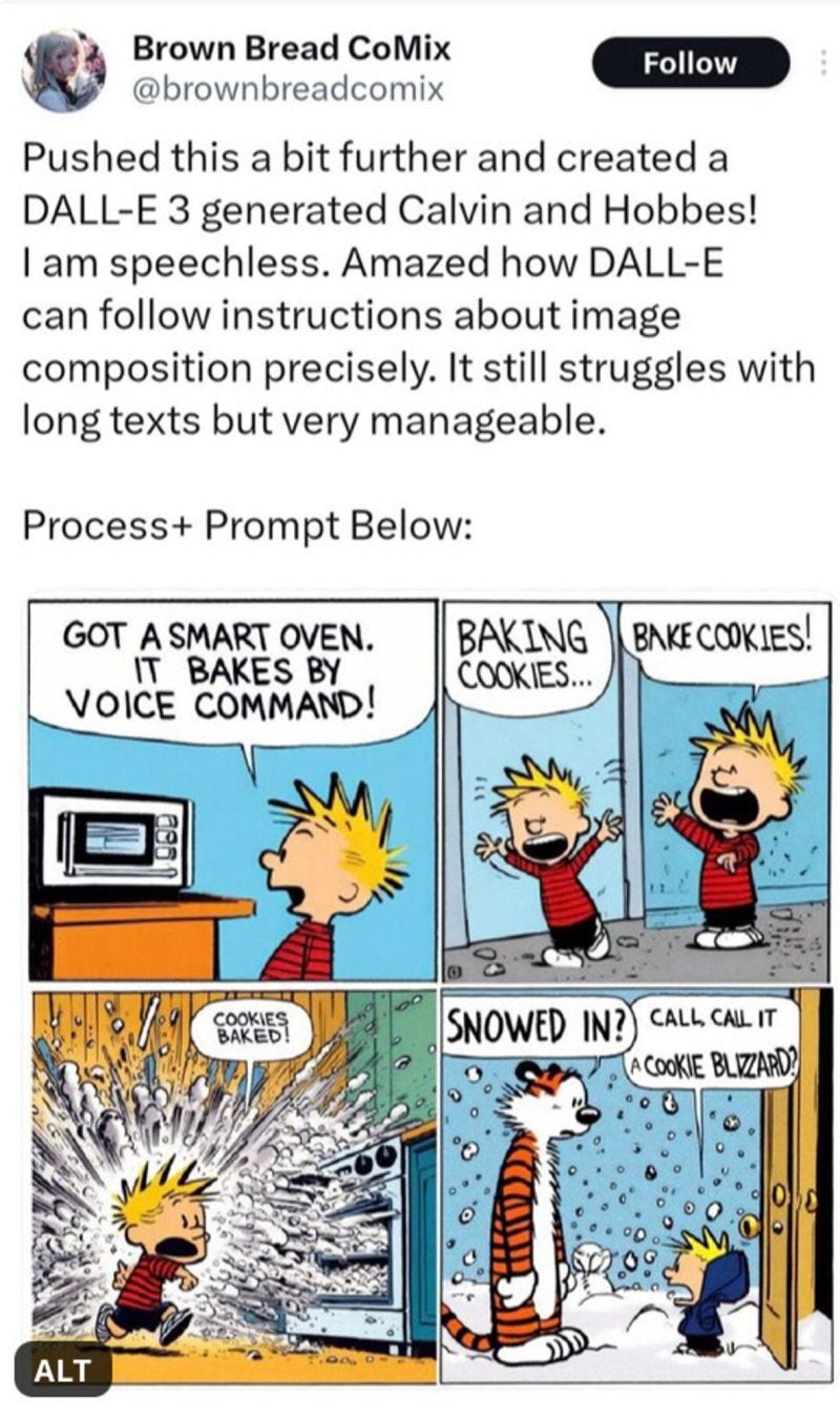 Here’s a Calvin and Hobbes comic, not made by Bill Watterson, but by a comic artist who, as you can see, did it using DALL-E 3. And I'll level with you, stick this in the pages of a C&H compendium, yeah, maybe it blends in with the crowd, even while it's not possessed of any insight or narrative rhythm or syntax or copy-editing.