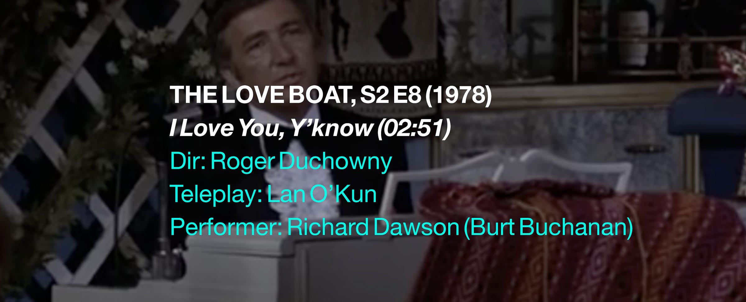 The clearinghouse, book-who’s-available toy chest of The Love Boat is as much a weakness as a strength8 - it stands to reason that when you’re trying to fill 43 (or in the case of this ep, 90) minutes a week, you empty your pockets and use what you’ve got.