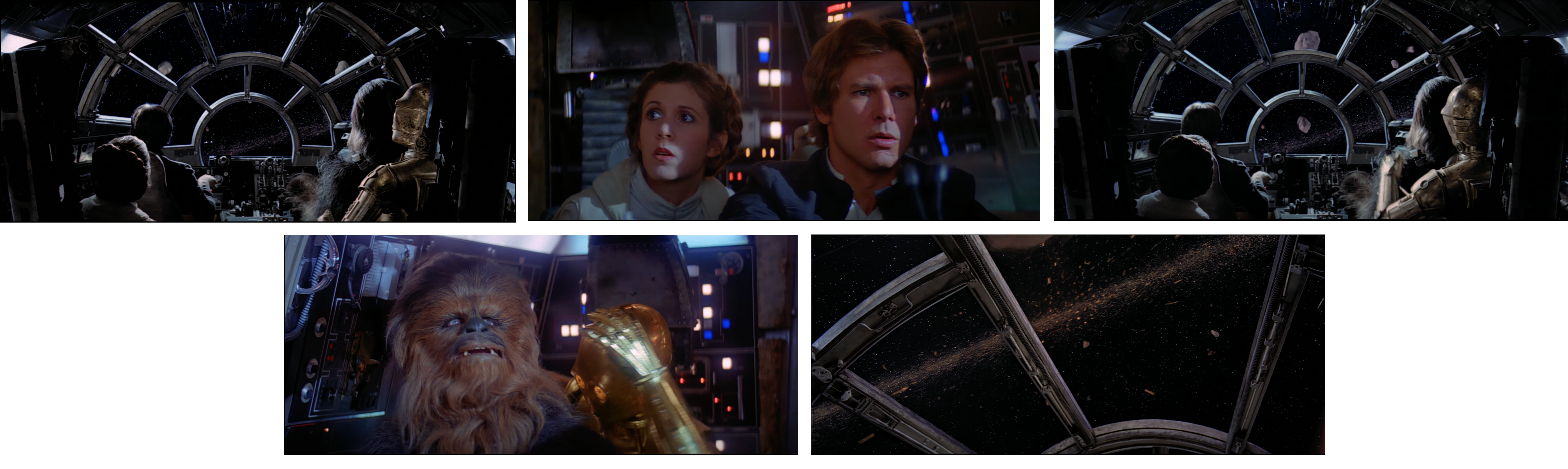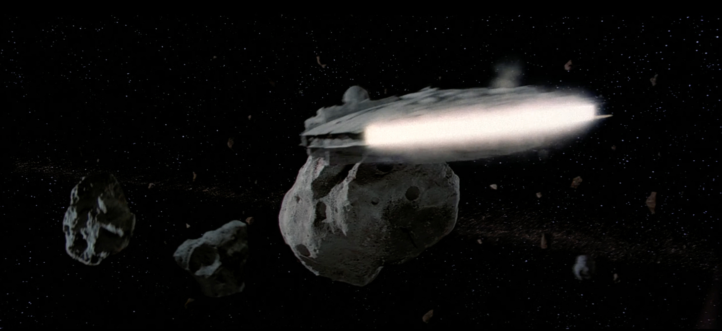 Han is visibly shaken. Even Chewie, the last to realize it’s going south, definitely realizes it’s going south. The ad hoc solution to blast their way through big asteroids shows that that just makes thousands of little asteroids (as if preemptively answering the proto-internet nitpick of “why don’t they just blast their way through?”)