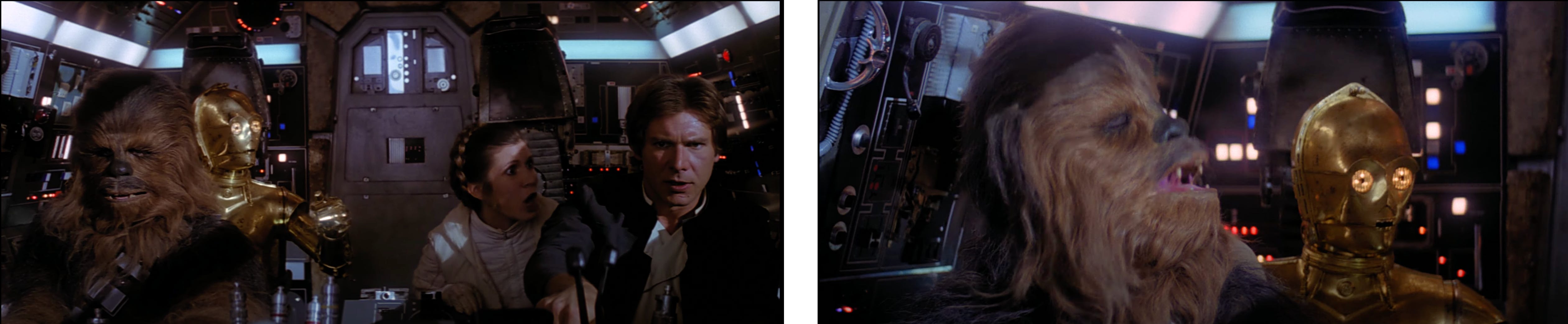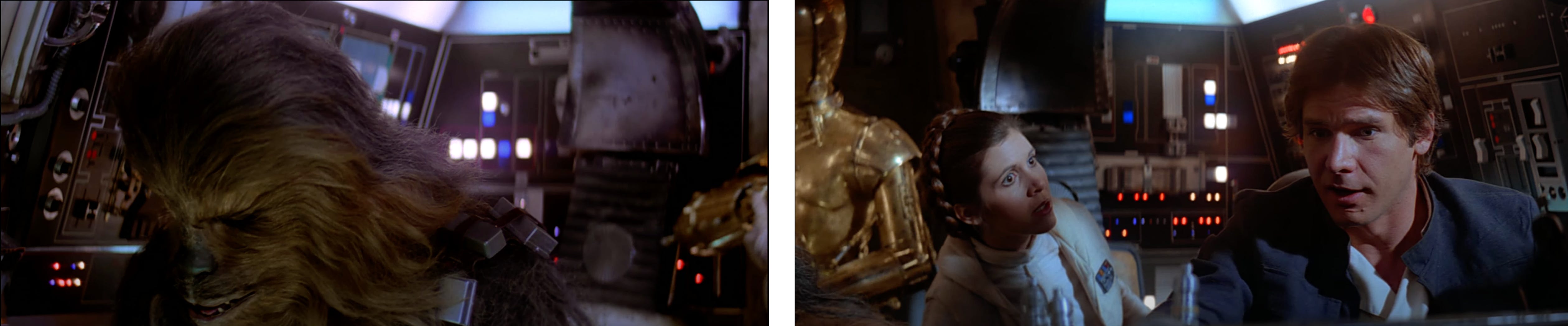The deft framing of these shots establishes the characters’ evolving dynamic - Han and Chewie aren’t exactly on-the-outs, but the situation is changing. Here, Chewie is alone, stoic in his no-fuss co-piloting, while “Mom and Dad” are isolated and bickering in their shared frame.