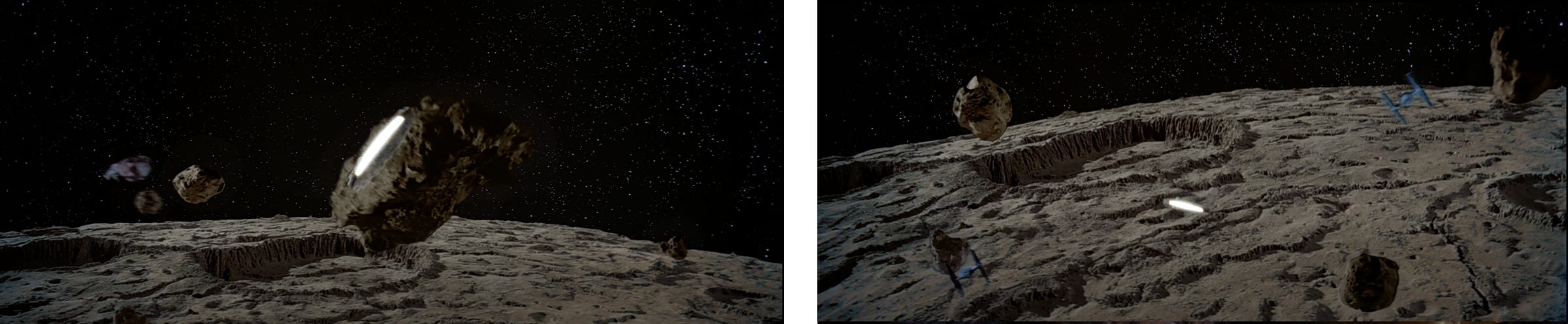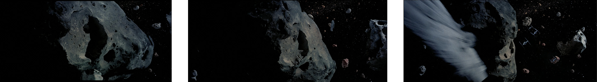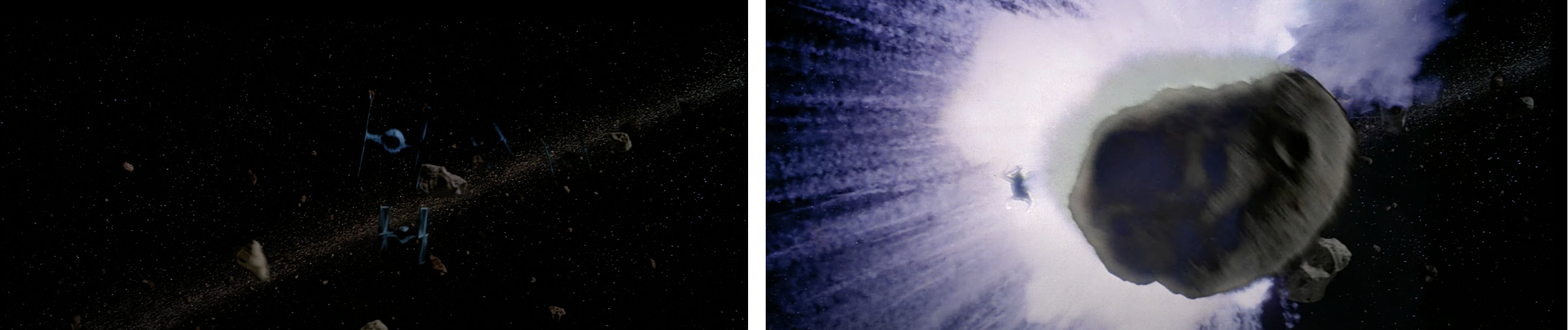 I suppose I could just as easily have dissected the AT-AT attack, but that trades in far simpler emotional states, namely dread and failure, and while it’s a technical marvel and a thrill to watch, it lacks that undertow of fate for me that the Asteroid Field deftly threads through its action beats.