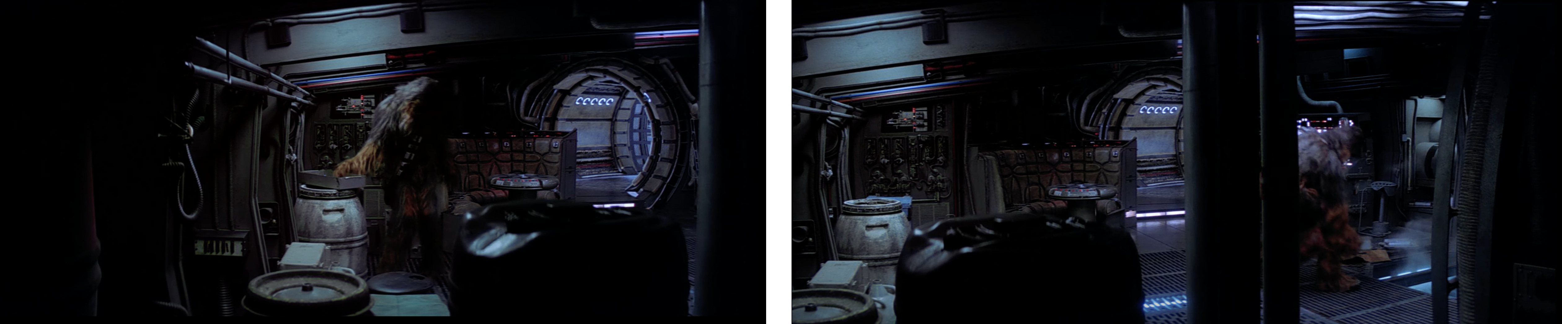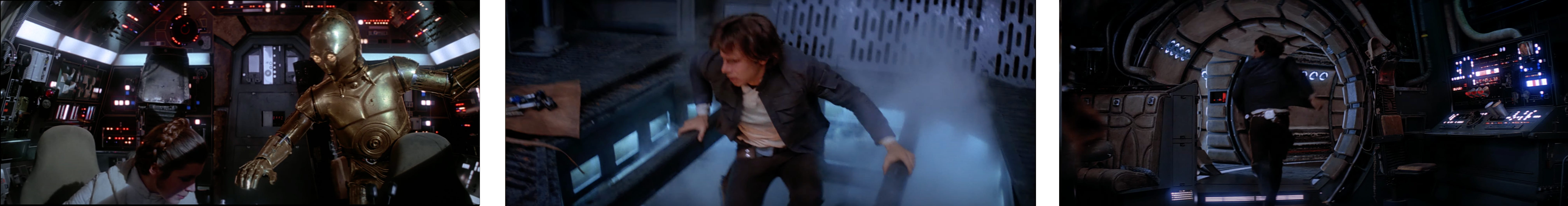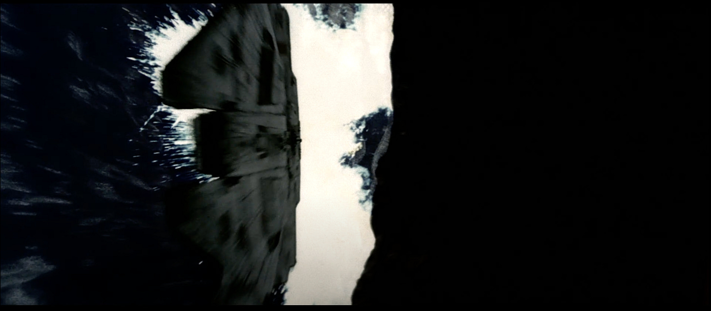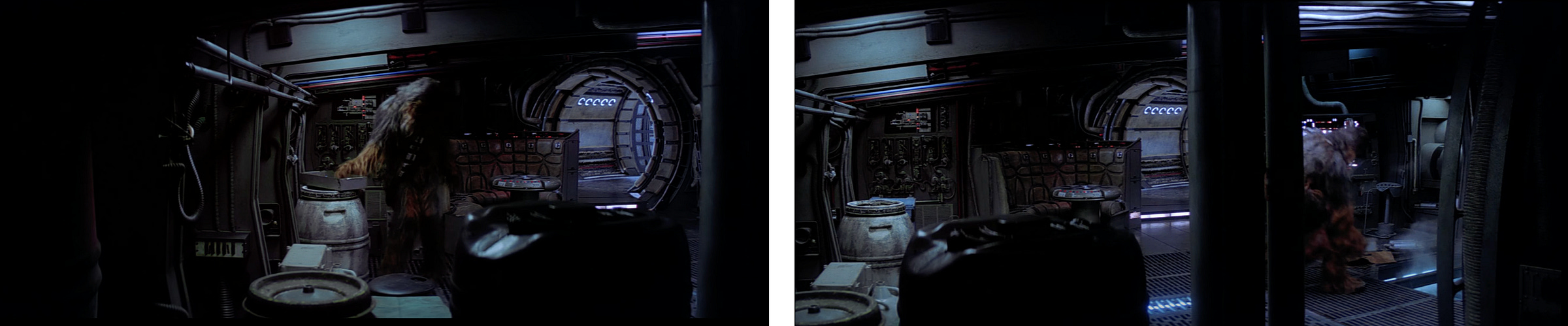 Here, too, the action reorients, with the Falcon repositioning to move from camera-right to camera-left, the direction of the action for the remainder of the sequence (tentatively established by Luke’s exit at the top of the sequence).