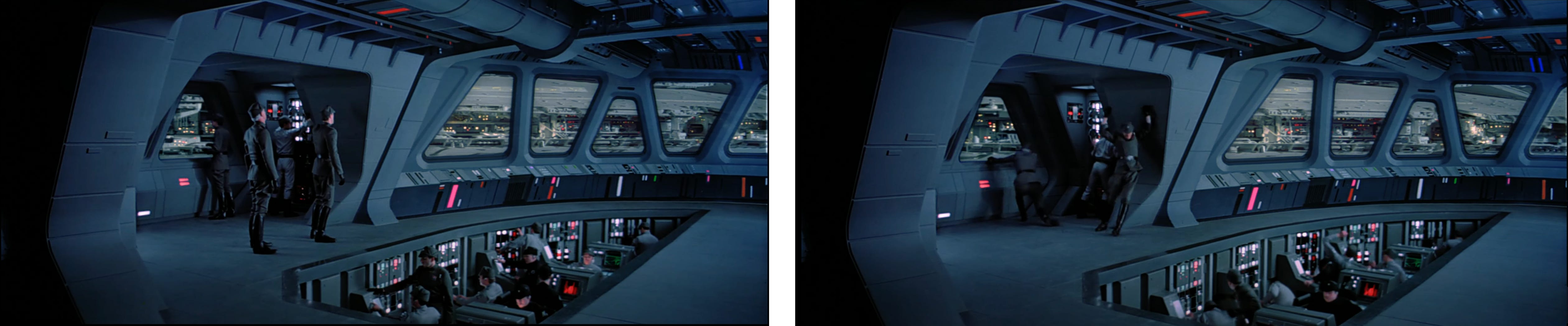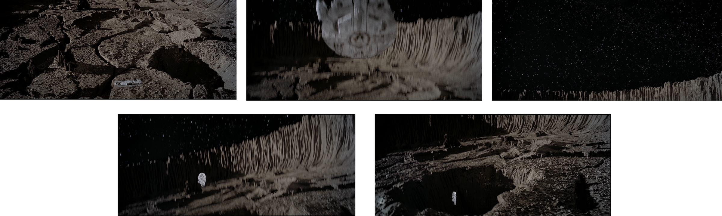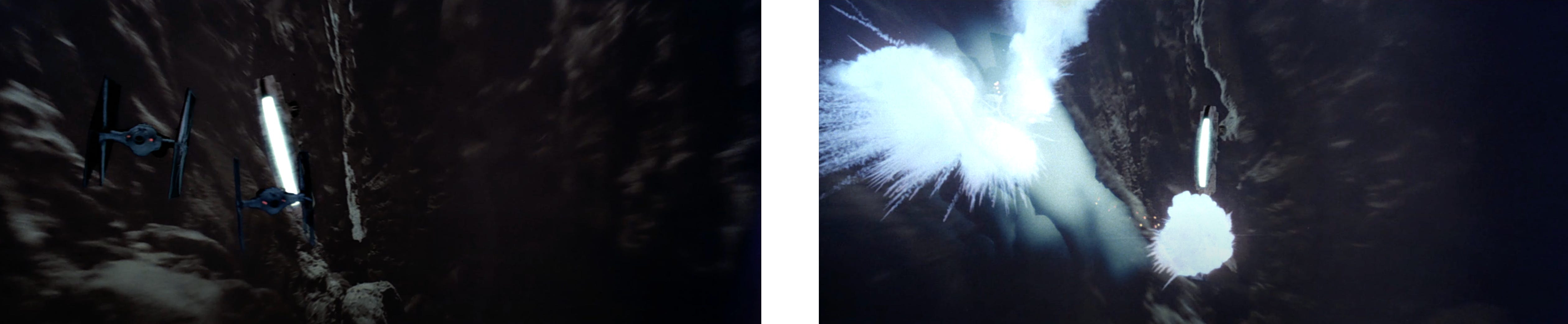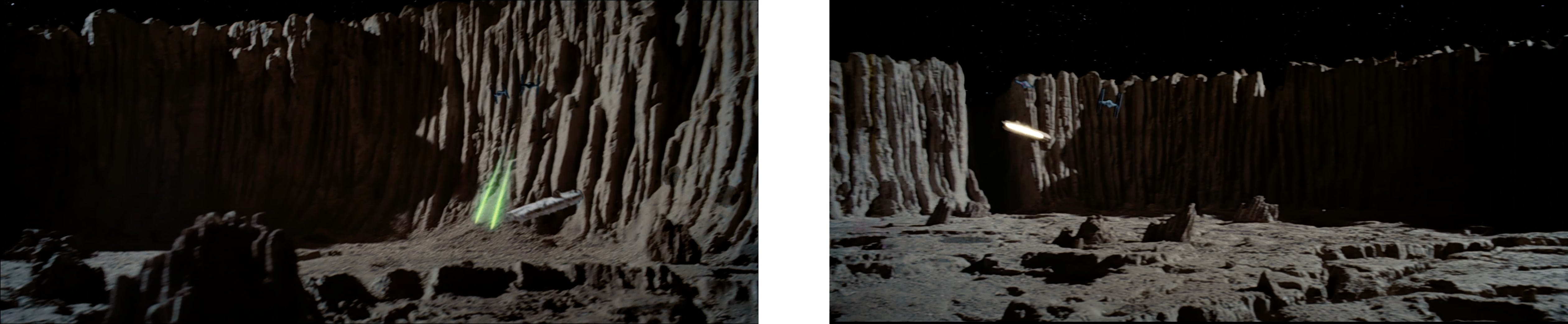 Here, too, the action reorients, with the Falcon repositioning to move from camera-right to camera-left, the direction of the action for the remainder of the sequence (tentatively established by Luke’s exit at the top of the sequence).