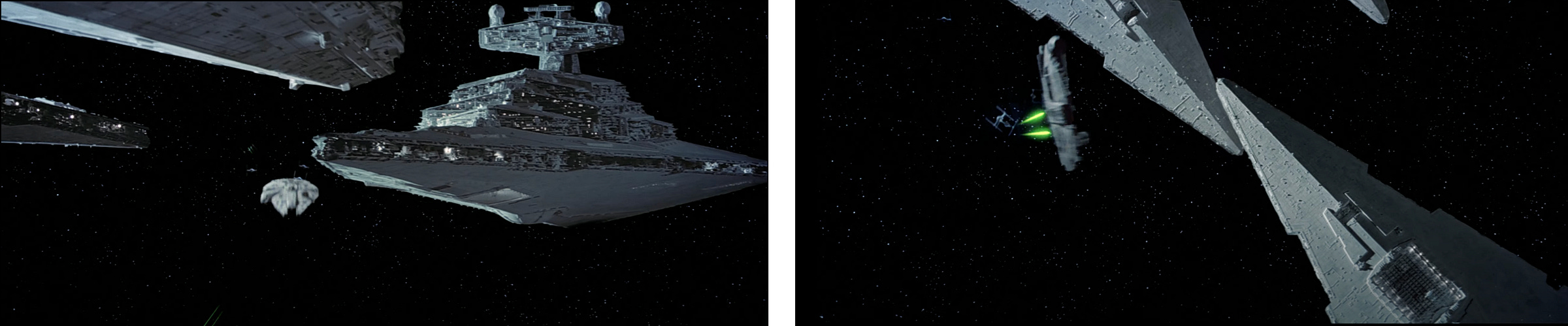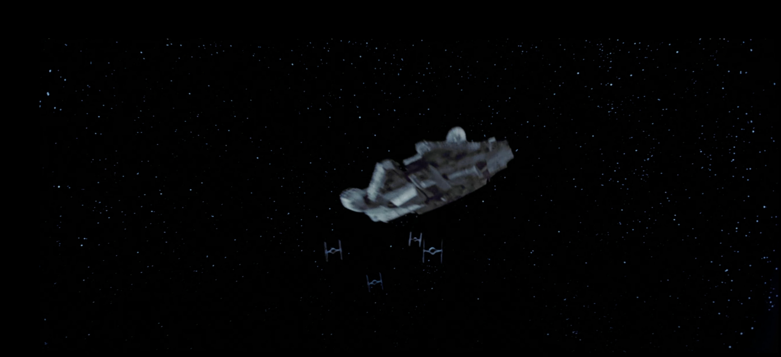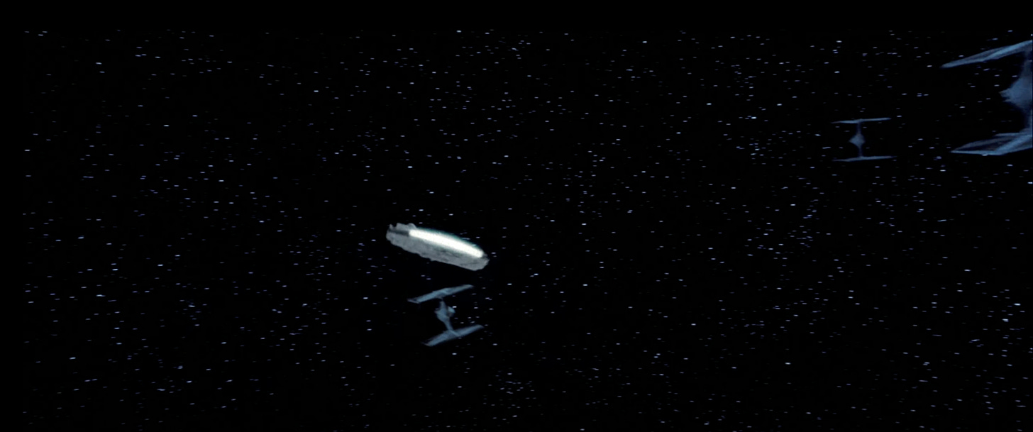 — as the approaching Star Destroyer visually swallows the fleeing Falcon. (This shot also more clearly establishes the four TIE Fighters that dog the Falcon through the sequence).