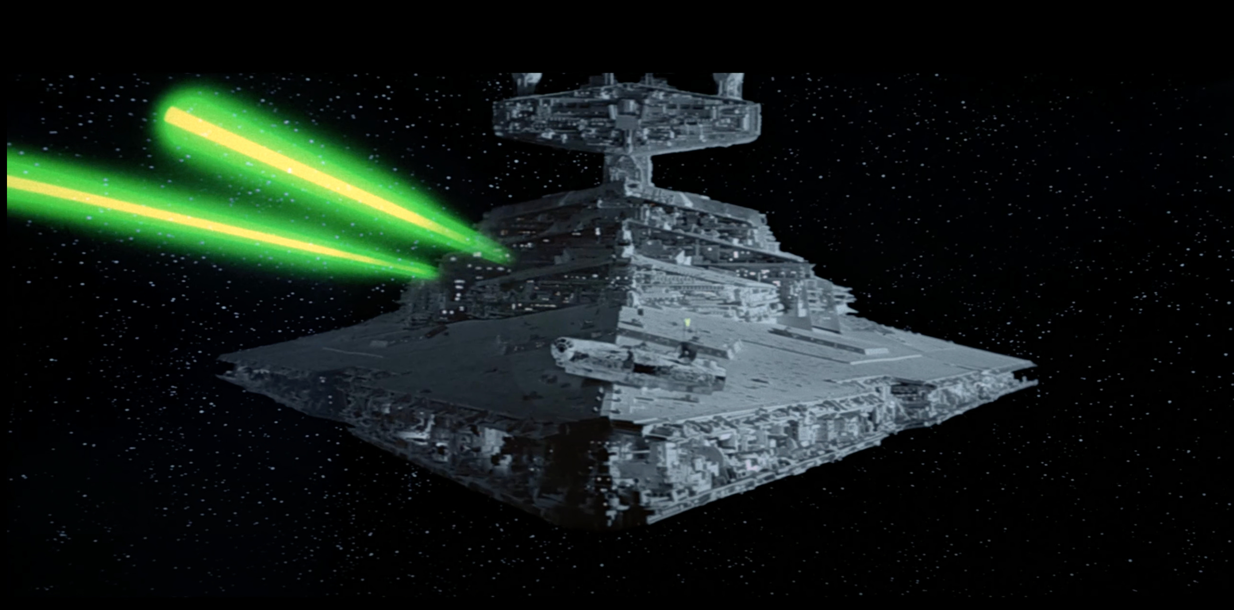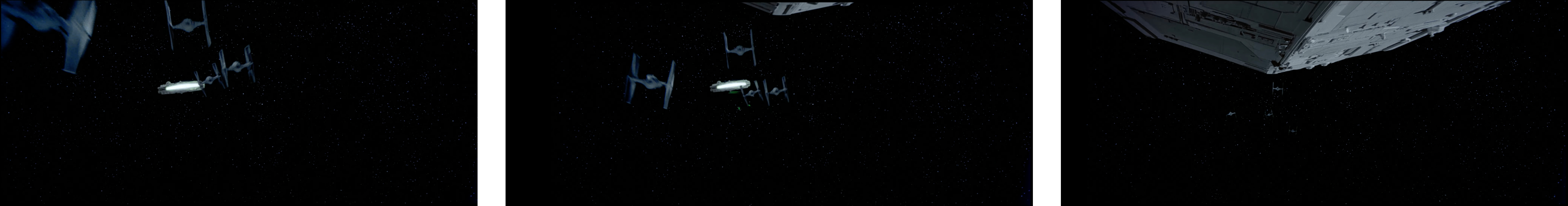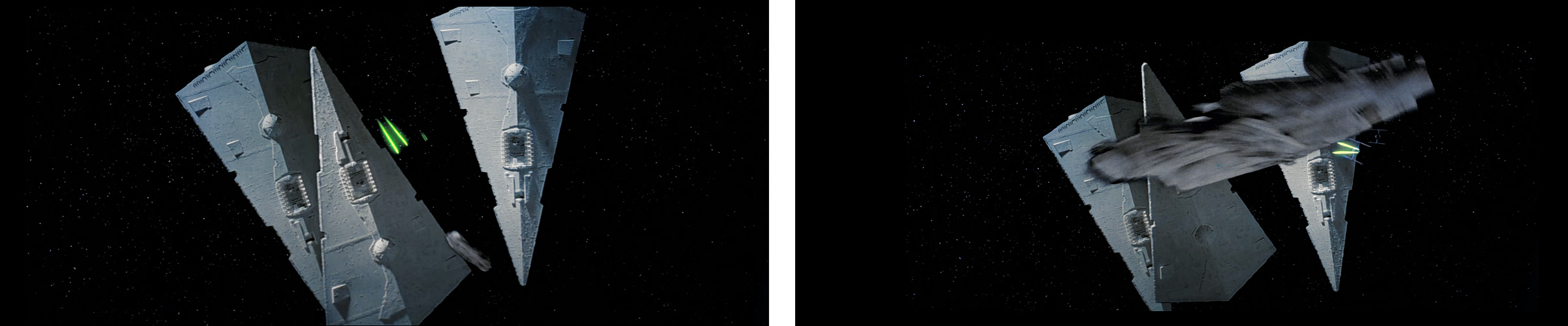 — as the approaching Star Destroyer visually swallows the fleeing Falcon. (This shot also more clearly establishes the four TIE Fighters that dog the Falcon through the sequence).