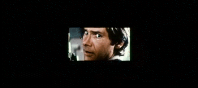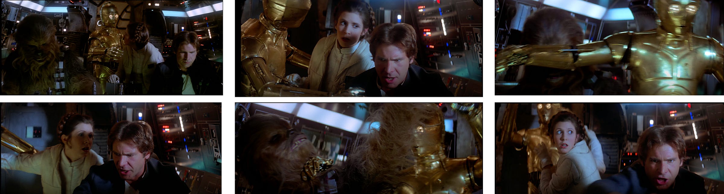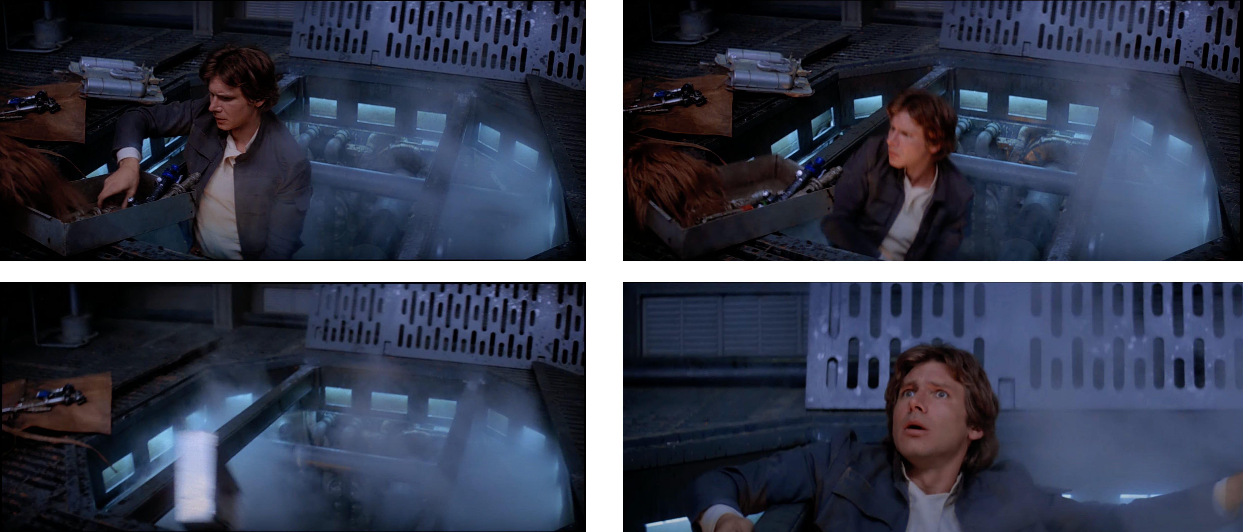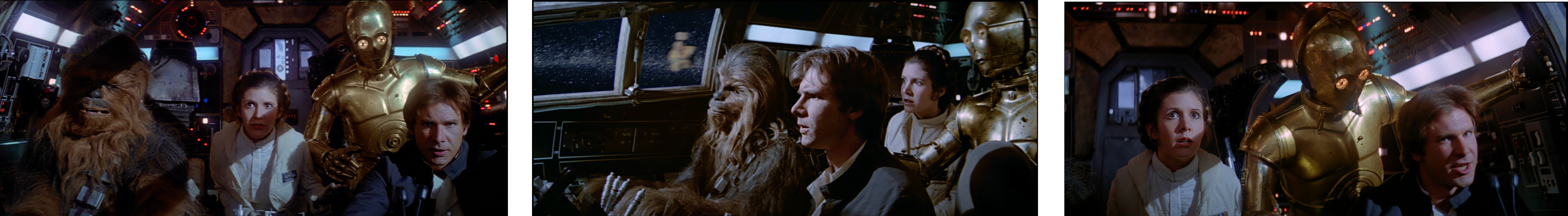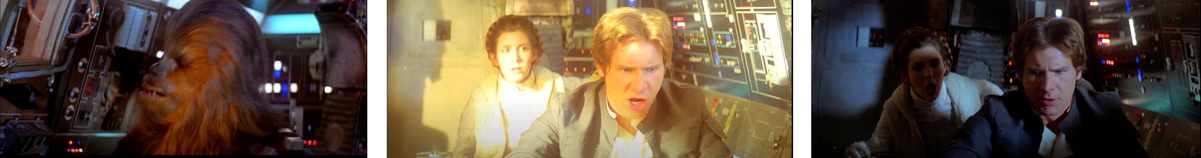 Then, Han’s legendary rejoinder, bringing us into the tightest framing of the trio of shots, steadily, rhythmically working inward.