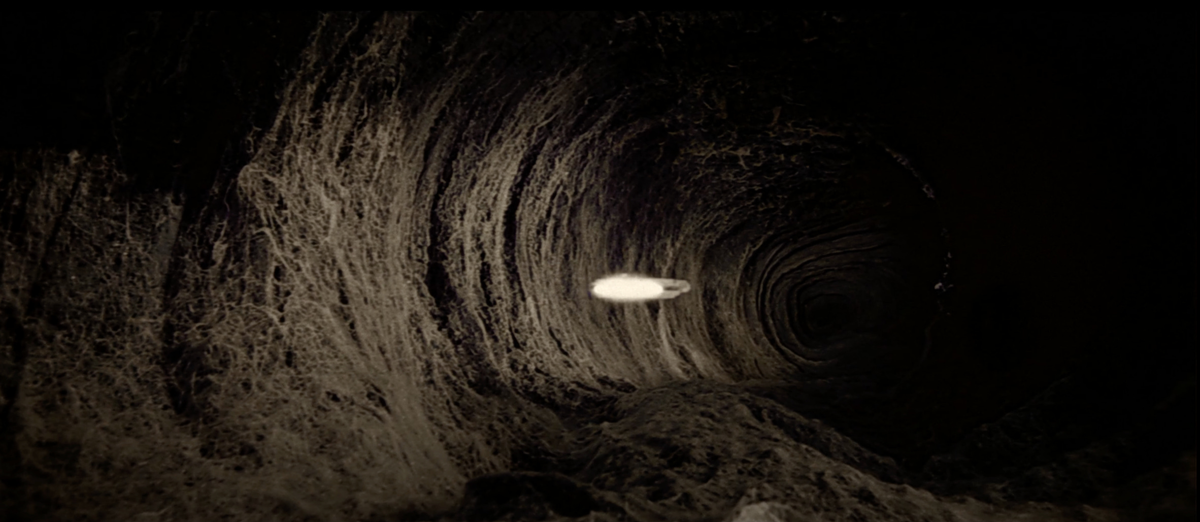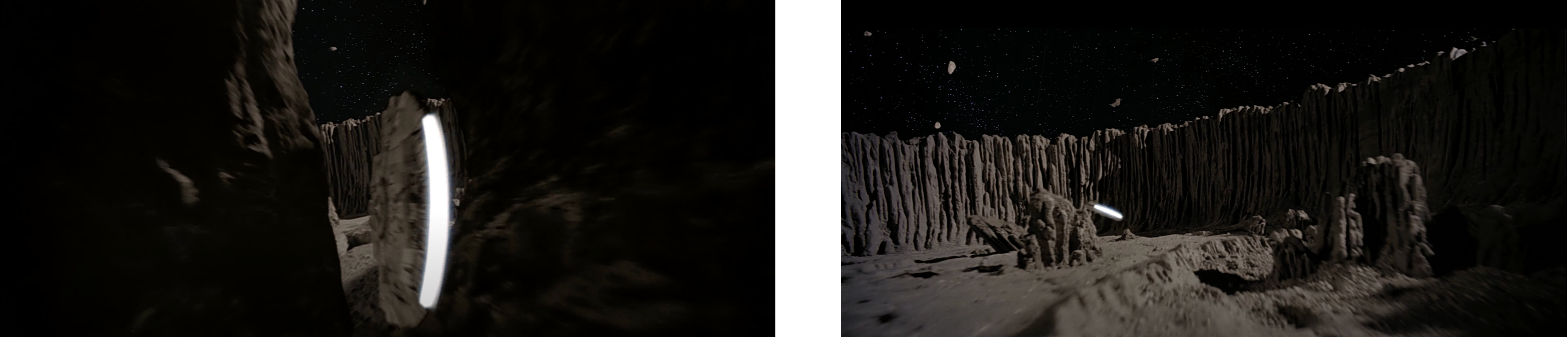 A panning shot (from, you guessed it, right to left) pulls the action across the crater floor, toward —