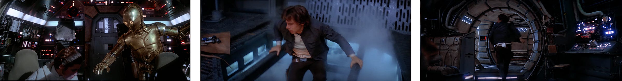 (I know “rising to the occasion” may feel like a reach, but I stand by it; in a richly-designed movie like this, every decision is deliberate, and means something. Han could have been working anywhere in the cargo bay - behind the wall, on the ceiling, what have you - the choice to put him under the floor and have him rise out of it not only harmonizes with his eventual fate late in the second act, but enables action with visual meaning, not just business for business’s sake.)
