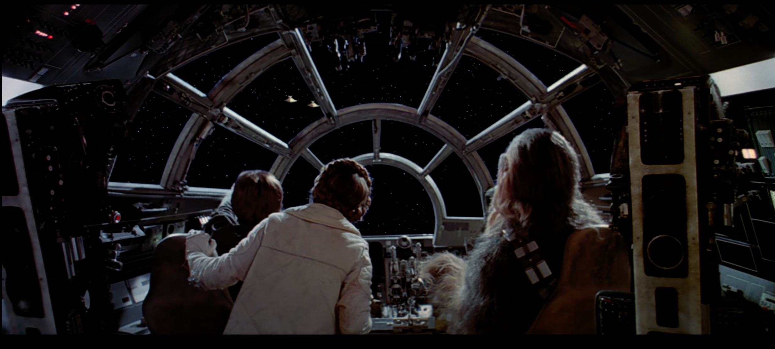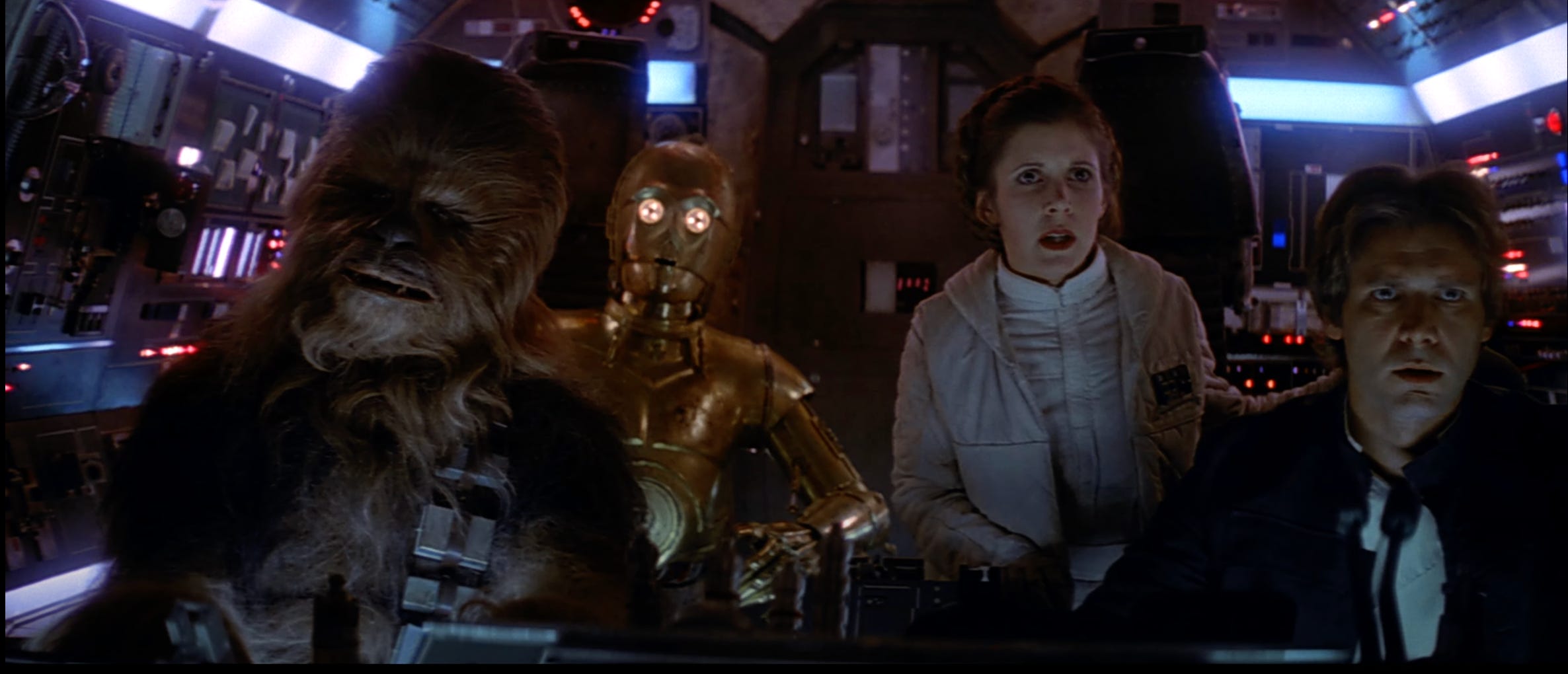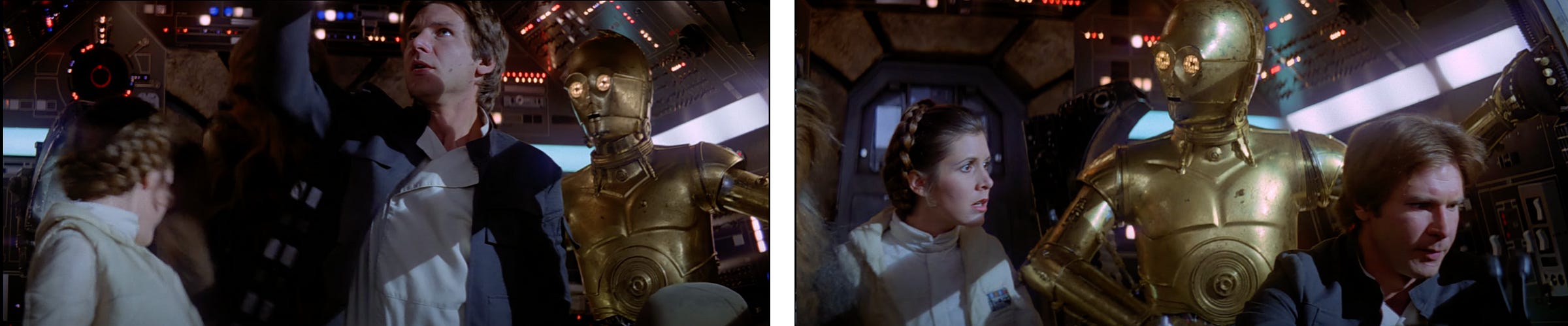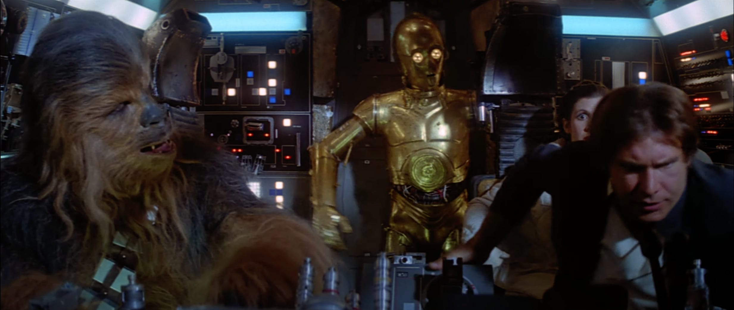 3PO’s recitation of the odds, where a quick reorientation brings us a new angle that gives the lie to Han and Chewie’s steely stoicism in the head-on view, and groups our family unit in the f.g. while keeping the omnipresent threat in the frame.