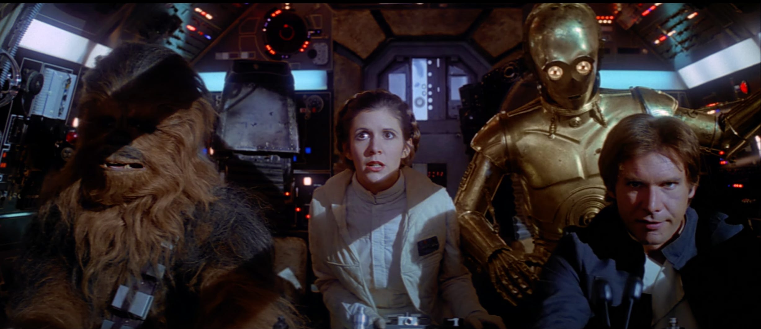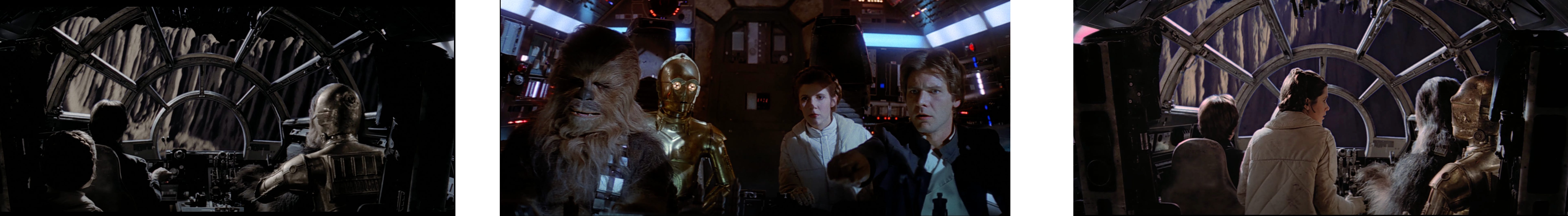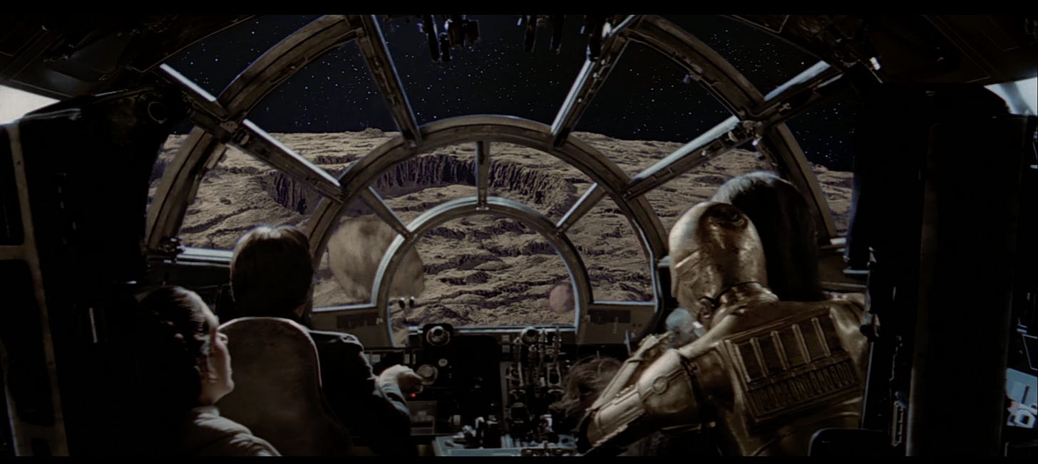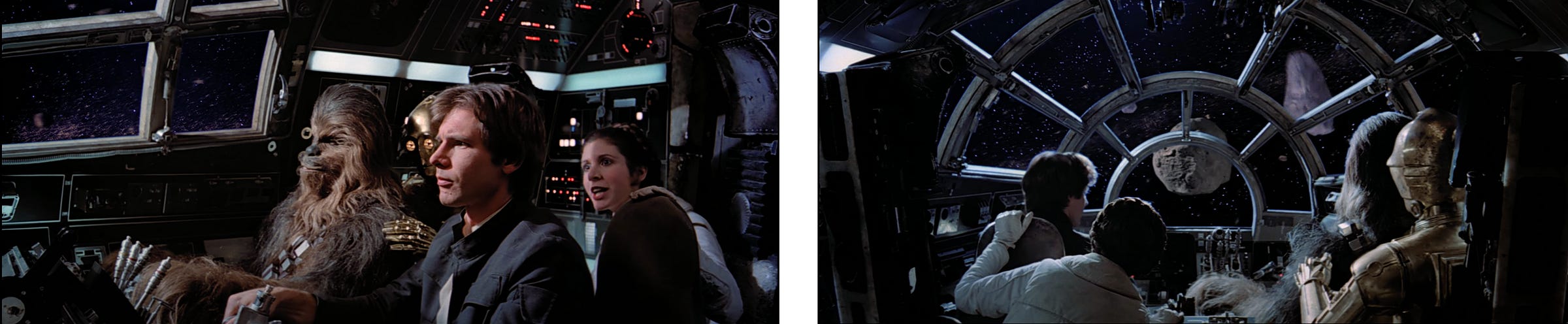 3PO’s recitation of the odds, where a quick reorientation brings us a new angle that gives the lie to Han and Chewie’s steely stoicism in the head-on view, and groups our family unit in the f.g. while keeping the omnipresent threat in the frame.