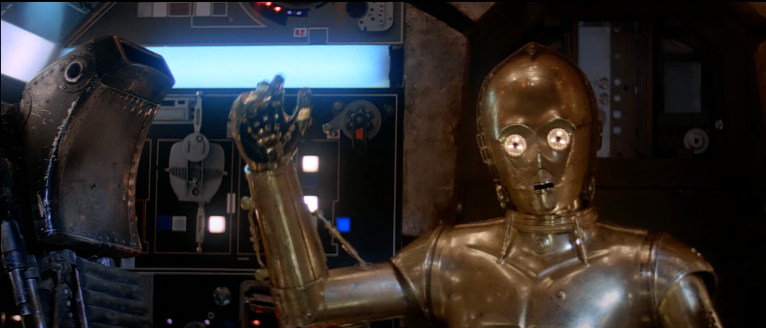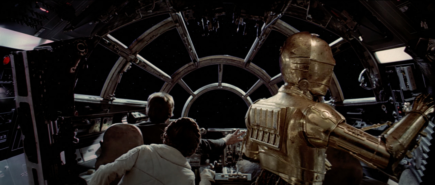 Finally, the floor is yielded to 3PO, and it’s worth noting how the staging of this beat is a subtle embodiment of the way these movies communicate with kids as well as adults. A child might be confused why a cockpit full of grownups is telling 3PO to shut up, or why they’re shoving him around - they’re all friends, right? - but a child understand that his most important statement cuts through the clutter —