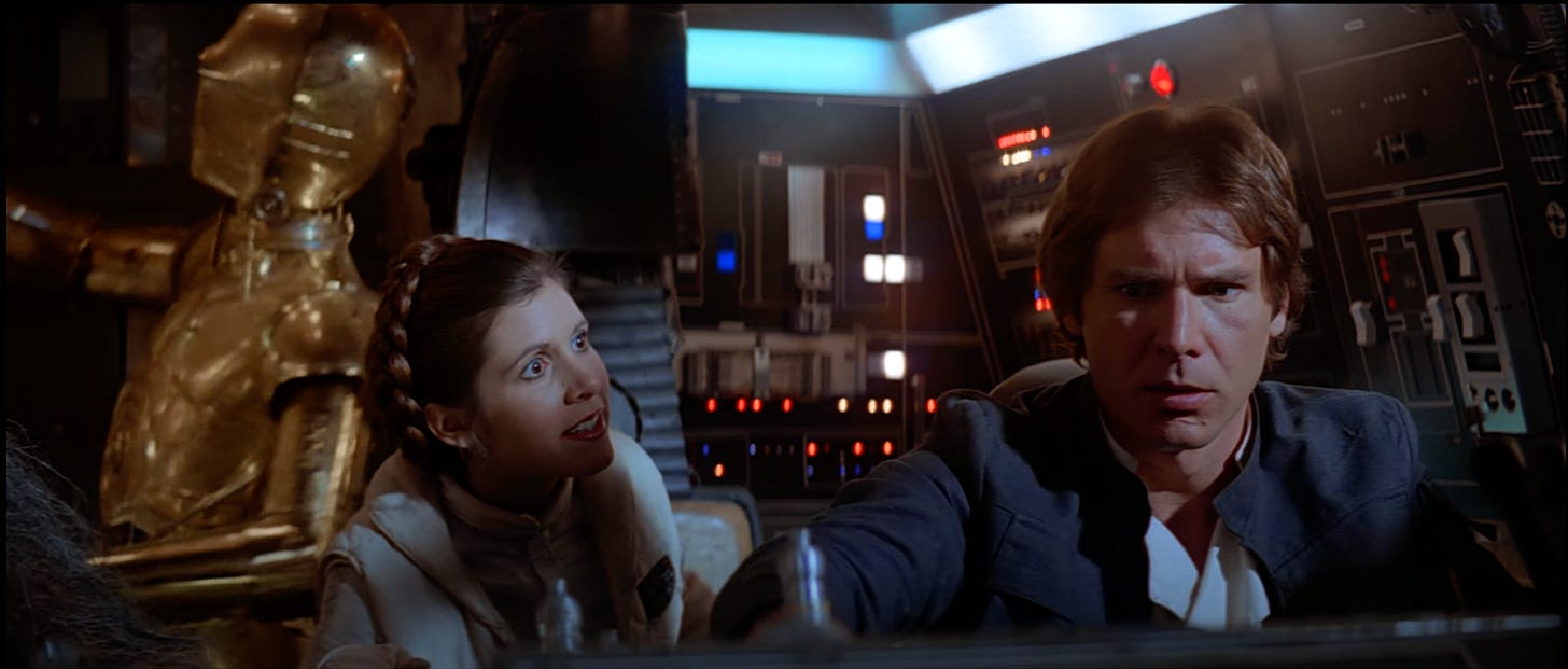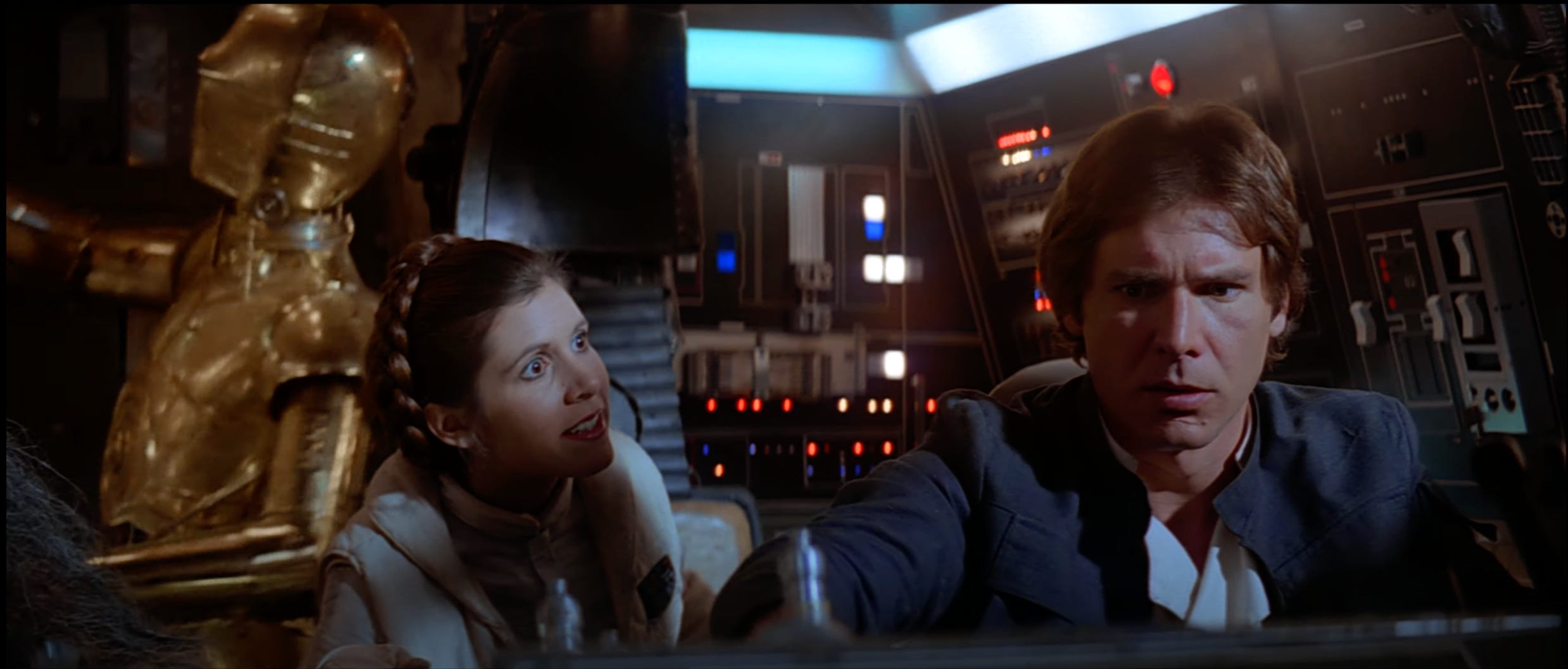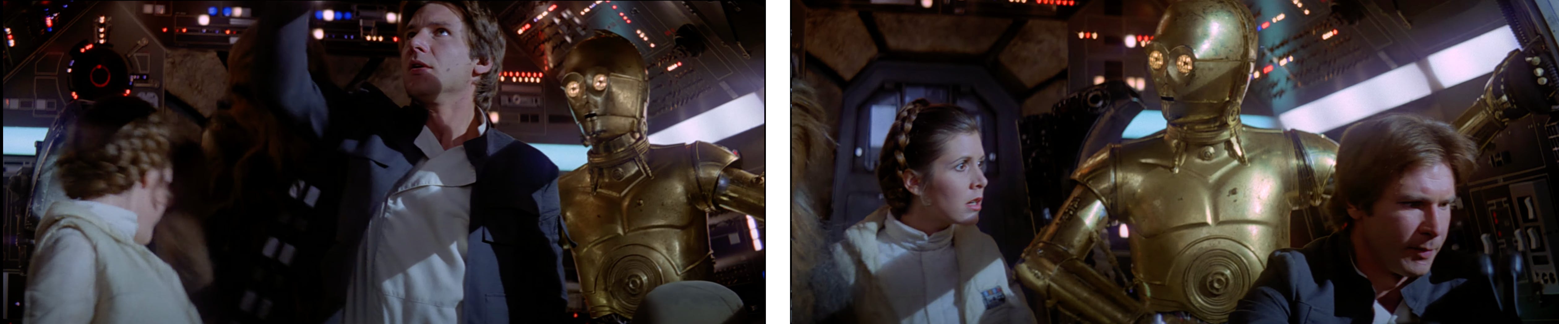 Leia, the voice of reason, urges Han to reconsider their current course; it’s notable that she’s framed to appear over his left shoulder, while 3PO was framed over Han’s right shoulder while spouting the odds Han famously doesn’t care about.