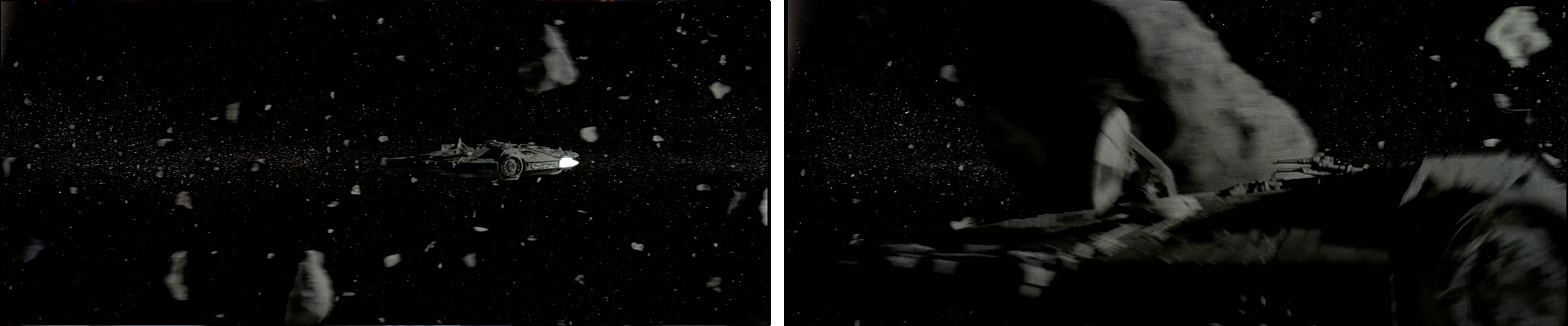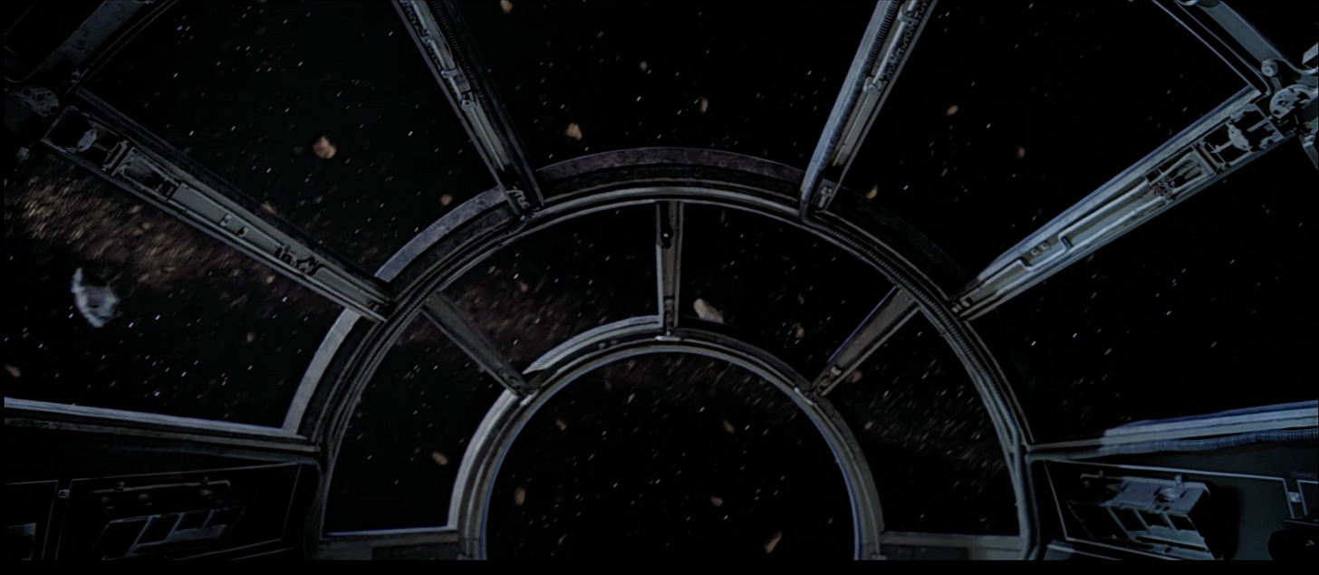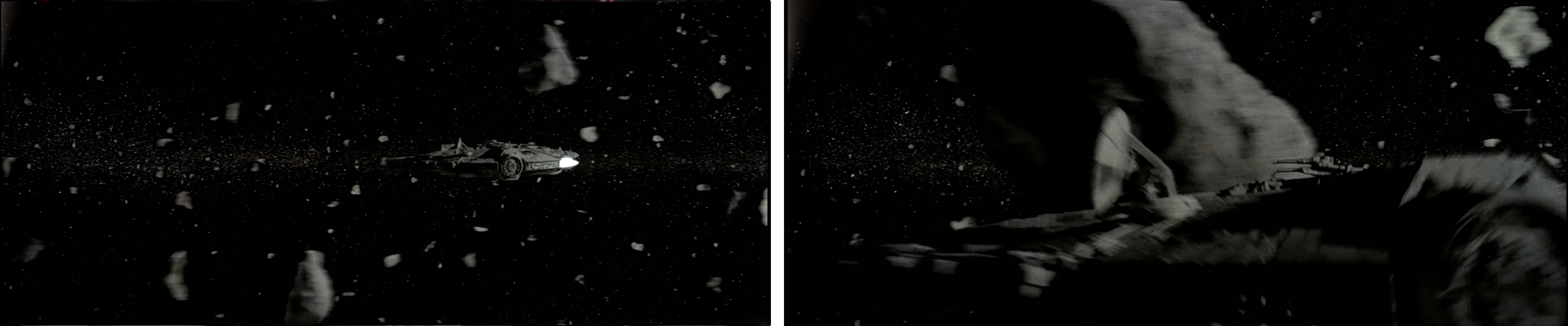 Han, still perturbed, moves into action - more steadily and on-point than we saw him a moment ago, tangled in pipes and steam. For Han, escaping the Empire is a matter of urgent necessity; the failed hyperdrive, a reflection of his inability to keep his ship whole; but an asteroid field? That’s force majeure, and it’s too irresistible a force to be reckoned with rationally.