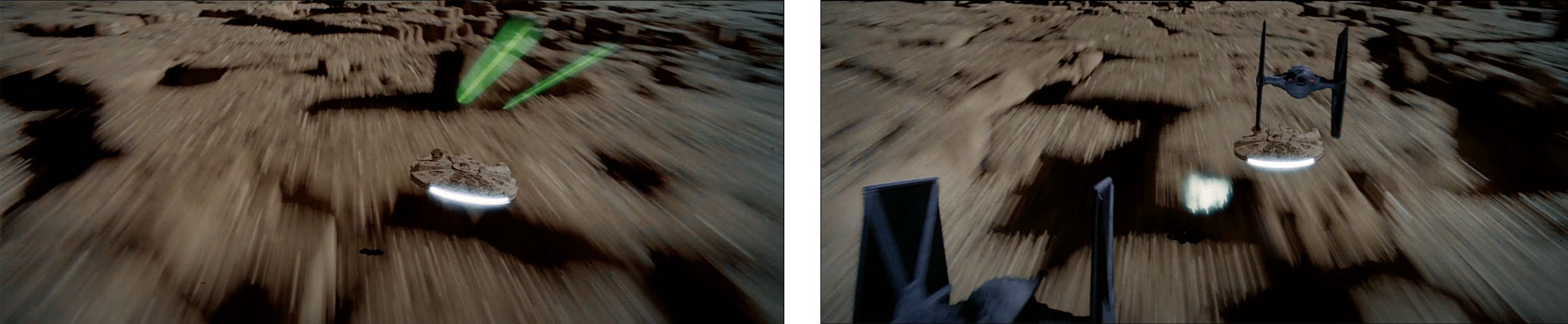 Until now, the Falcon’s been able to keep a lead on the TIEs, but as we ramp into the climax, that lead dwindles, as the TIEs enter the pursuit frame lasers-first.