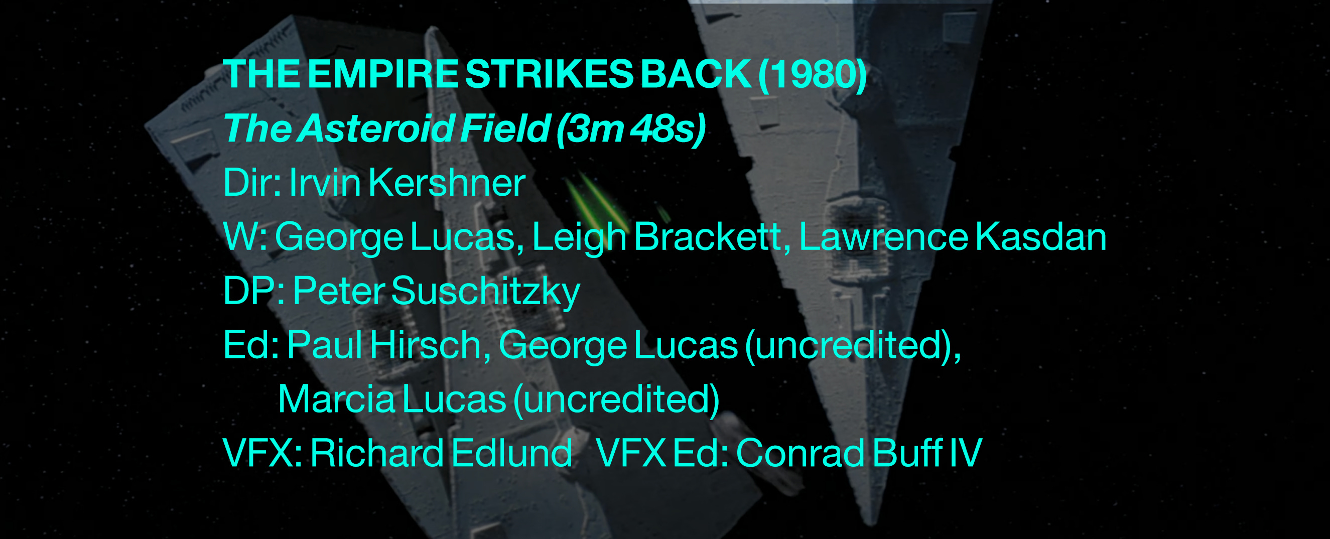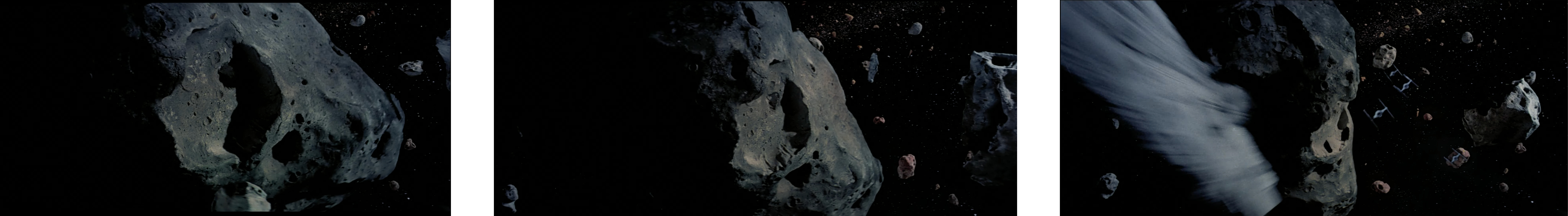 At the time of Empire’s release, it wasn’t hard to see this sequence as a standout (considering the grand total of Star Wars material was four hours and change, or if you count the Holiday Special, eighteen hours). Even now, nearly half a century later, you could take the total tonnage of the days’, maybe weeks’ worth of Star Wars (oh that word) content, and leave me the Asteroid Field and I’d be fine. (Ok, maybe a few other highlights, too, like I’m Navin Johnson cherry-picking a paddle-ball, ashtray and chair on the way out the door)
