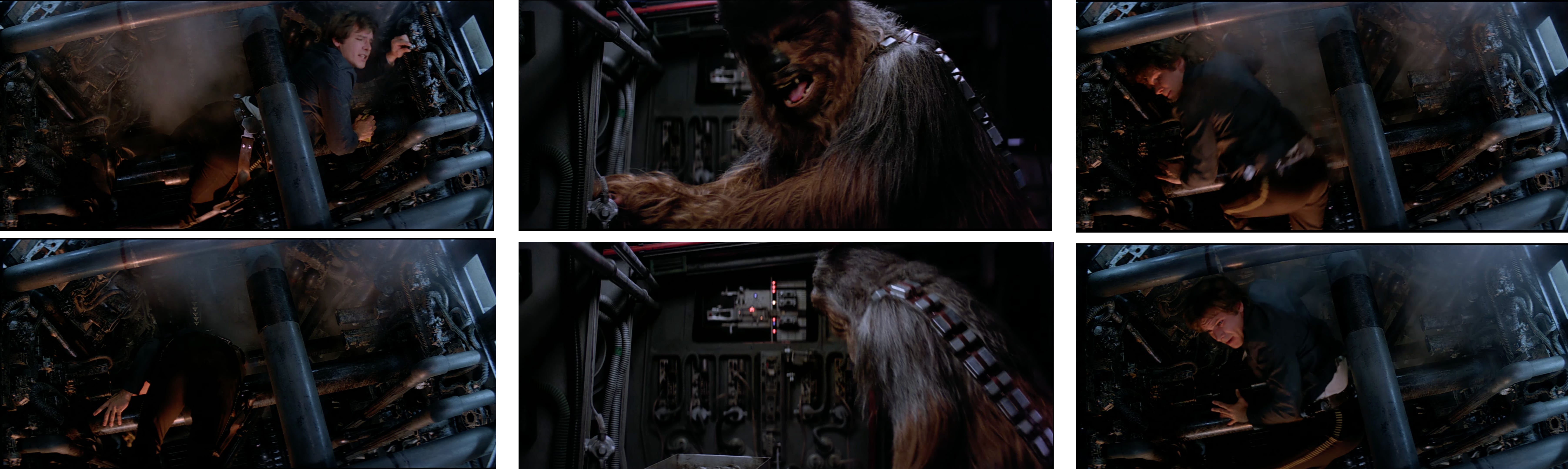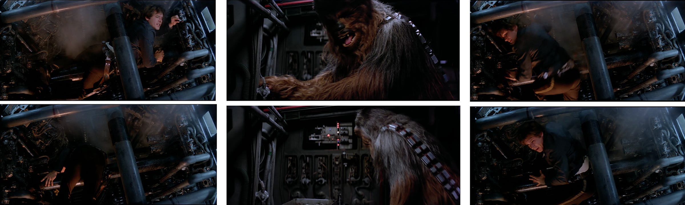 We get more examples of this sequence’s use of reoriented axes (Han’s contortions in the subflooring) and in medias res action - Kershner & co. get a laugh cutting straight to Han already tangled in the pipes, rather than spend time on how he got here. (Contrast this with the comparative shoe-leather of Han and Luke climbing into the turret guns in ANH, or for that matter, the prequels, which feel like 90% shoe-leather).