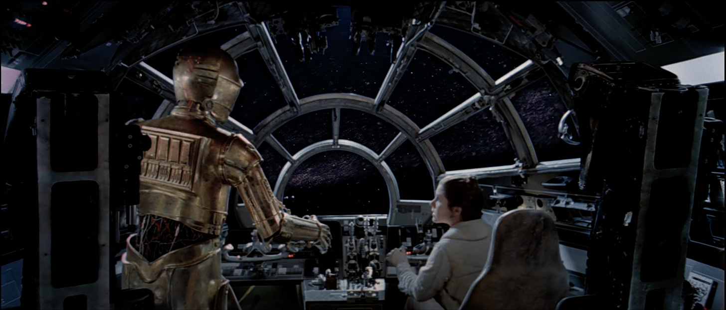 It’s telling, by the way, that 3PO would stand over Han’s shoulder, when his more accustomed spot in the cockpit is the passenger seat behind Chewie (see the hand-raised shot). It’s a sequence full of characters at odds with themselves - Han, a double-fugitive trying to do the right thing; Leia, unwittingly falling for the guy who’s about to get them killed - so why should 3PO, torn between the Jiminy Cricket need to be heard, and the self-preservational instinct to stay near the most protective force in the cockpit, be any different?